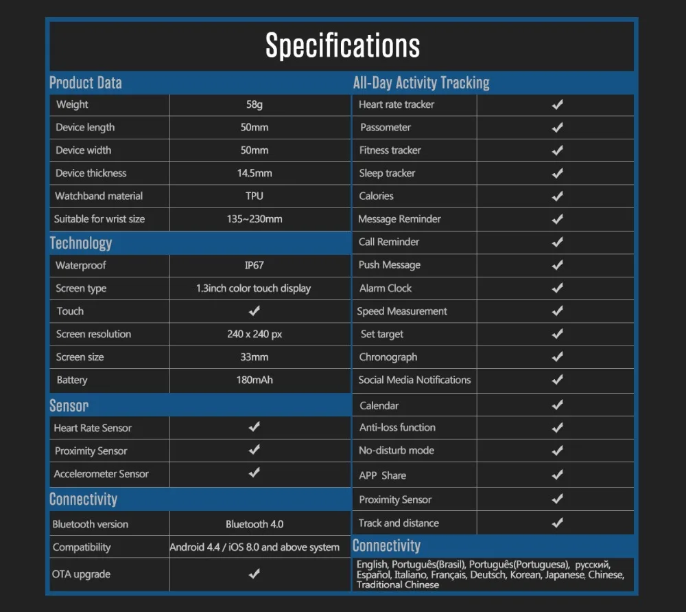 Smartwatch Language: English, Português(Brasil), Português(Portuguesa), русский, Español, Italiano, Français, Deutsch, Polish 한국어, 日本語